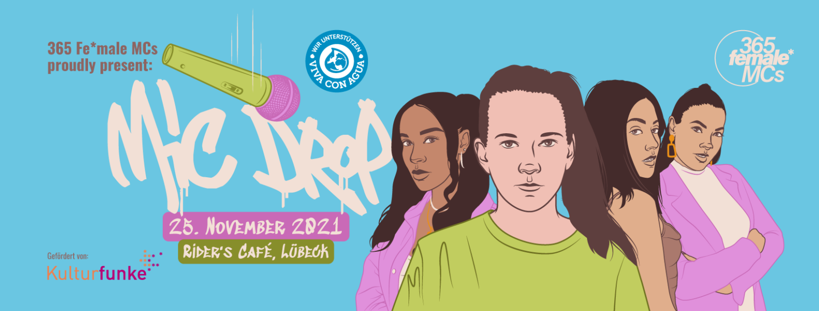 Mic Drop besteht normalerweise aus einem Insta-Takeover und einem Live-Stream bei Twitch – jeweils auf den Accounts von Viva con Agua. Über den kompletten Tag des Takeovers werden Spenden für die NGO gesammelt, die sich für den Zugang zu sauberem Trinkwasser auf der ganzen Welt einsetzt. Nun gehen wir mit Mic Drop einen Schritt weiter: Am 25. November wird erstmalig eine Live-Version des Formats stattfinden: Insgesamt vier Artists teilen sich die Bühne des Rider’s Café in Lübeck. Das Event wird, für alle, die nicht dabei sein können, wieder live auf dem Twitch-Kanal „viva_con_agua“ übertragen.
